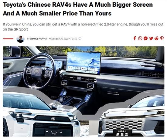 该车延续了海外版的设计,然而内饰则针对中国市场进行了定制化升级,价格还更便宜,如此让不少美国人心生羡慕,知名汽车媒体Carscoops就发布了文章《丰田中国版RAV4配备了比你们的车型大得多的屏幕,而价格却低得多》。